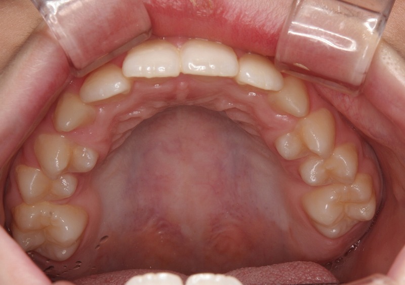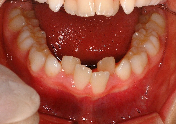 ①術前 8歳 下顎4前歯の歯が並ぶスペースが不足。歯列弓も狭少。
