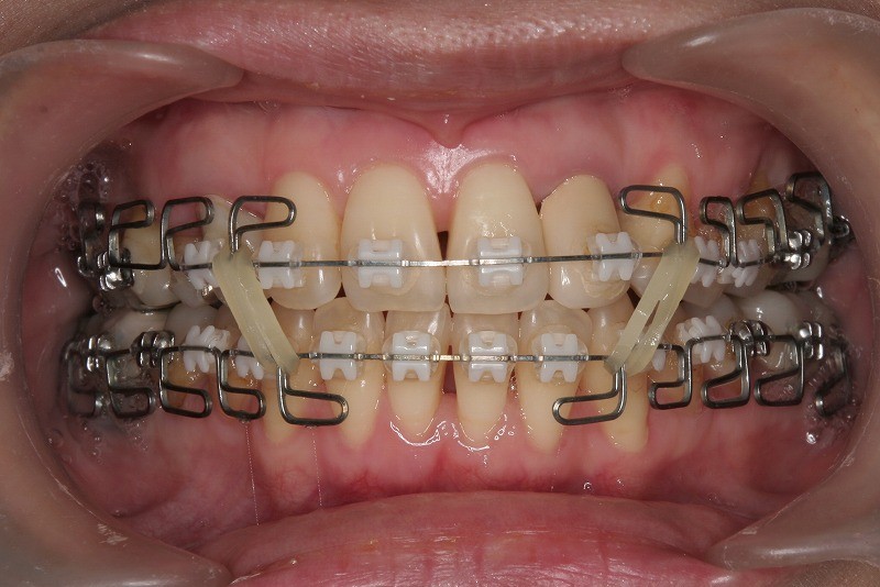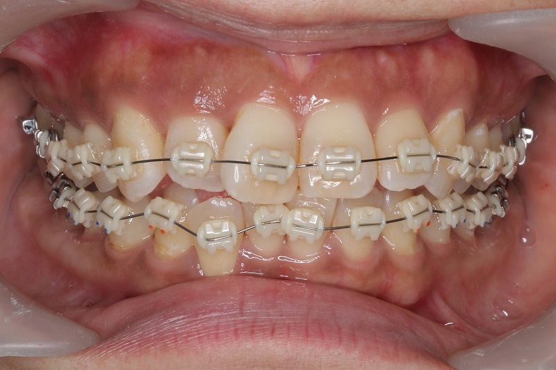 本格治療(二期治療)は永久歯咬合がほぼ完成し、大きな成長発育の時期が過ぎてから、厳密に歯を動かして良い咬合を形成するために固定式の留め具(マルチブラケット装置)を用いて矯正します。